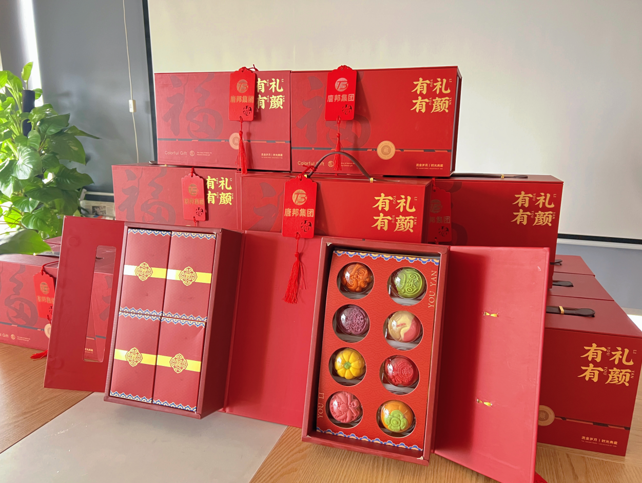 “有礼”,寓意着公司对全体同仁的尊重与礼待,传递“以人为本、关怀备至”的企业文化;“有颜”,则彰显礼盒的精致外观与卓越品质,尽显公司对细节的把握与对员工的用心。收到礼盒的那一刻,没人不被那一抹正红包装吸引,鲜艳欲滴的红如燃烧的火焰,洋溢着浓浓的节日氛围,点燃了每个人心中的喜悦与期待。包装上精心设计的图案、细腻入微的纹理,透着典雅质感与极致用心,每一处细节都藏着公司对员工的重视。而礼盒内的各式月饼,宛如一件件精致艺术品,让人爱不释手。