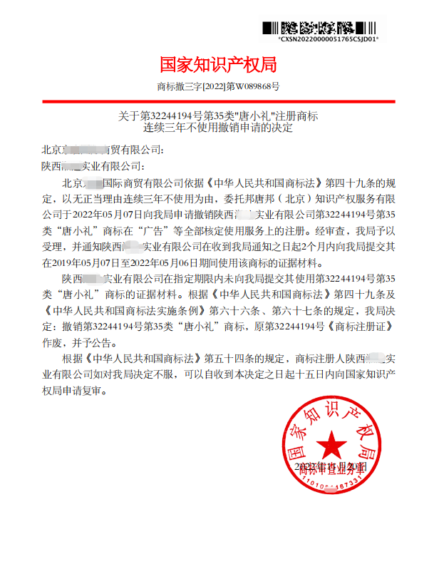 因被申请人未按期提交相关材料,国家知识产权局依据商标法相关规定,作出决定:撤销第32244194号第35类"唐小礼"注册商标,原《商标注册证》作废,并予以公告。