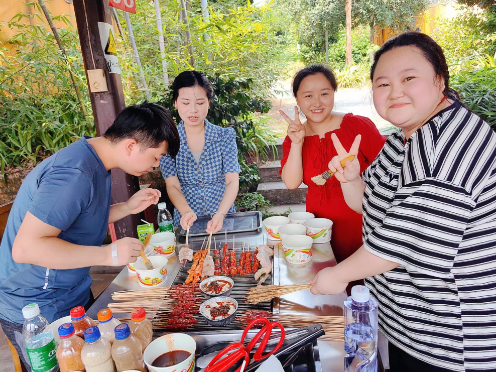 牛肉串、羊肉串、鸡翅、鱿鱼、排骨......种类丰富,烧烤架上的食物滋滋作响,香气逼人,打开大家的味蕾。烤好的肉串外焦里嫩,入口的一瞬,从舌尖传递到全身,真是美妙!再配上冰镇啤酒与饮料,大口吃肉来得畅快!小伙伴们吃着各种烤串,聊着自己在工作和生活中遇到的趣事,其乐融融。