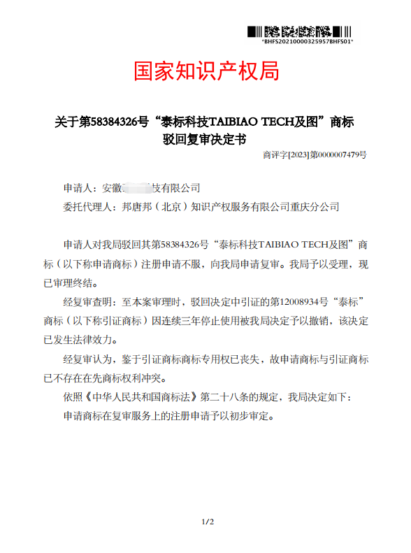 国家知识产权局经复审查明,至本案审理时,“泰标” 商标(引证商标)因连续三年停止使用被我局决定予以撤销,已不存在在先商标权利冲突。故决定:申请商标在复审服务上的注册申请予以初步审定。