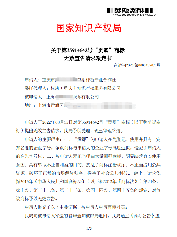 我司受申请人委托,针对第35914642号“贡卿”注册商标向国家知识产权局提出无效宣告请求。