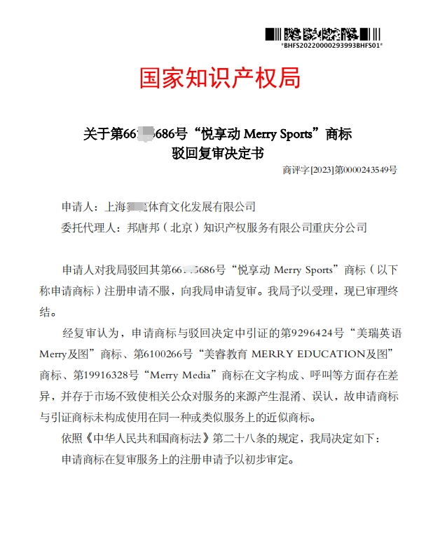 申请人不服国家知识产权局驳回其第66***686号“悦享动 Merry Sports”商标(以下 称申请商标)注册申请不服,委托我司向国家知识产权局申请复审。