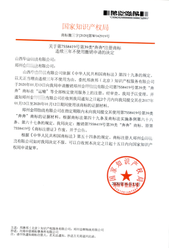 关于第7558419号第39类“奔奔”注册商标“撤三”决定书